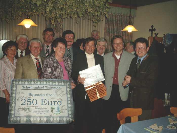 Sepp Seidl übergab auch noch eine Baustein-Aktie im Wert von 250 Euro für die Schwimmbad-Baustein Zeichnung, die demnächst beginnt.