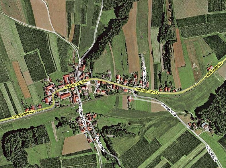 Ingolstadt und Landshut, inmitten der Hallertau. Das Dorf ist